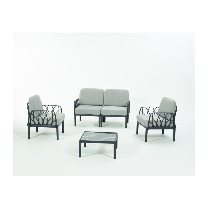 struttura in polipropilene rinforzato in fiblerglass. Antistatico, resistente ai raggi UV. Composta da 1 divano 2 posti cm 140x75x78h2 poltrone cm 71,5x75x78h1 tavolino cm 75×62,5x37hColore antracite con cuscini grigio melange