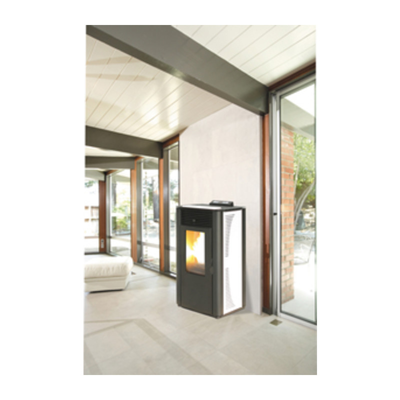 Mod. KING 14 IDRO Certificazione ambientale 4 stelle. Rivestimento in acciaio con top in maiolica. Irraggiamento frontale. Cassetto cenere. Scambiatore di calore con sistema di pulizia manuale. Resistenza in ceramica. Termostato di sicurezza. Termostato interno. Predisposizione per termostato esterno. Cronotermostato settimanale. Telecomando. Pompa circolazione modulante. Vaso di espansione. Valvola di sicurezza 3 bar. Valvola sfogo aria automatica. Potenza termica nominale 5,0 – 13,8 kW. Volume riscaldabile 340 m. Potenza resa allacqua 3,81 – 10,53 kW-H2O. Capacit serbatoio 17 kg. Potenza termica globale 5,2 – 14,8 kW. Consumo orario pellet 1,067 – 3,017 kg/h. Scarico fumi 8 cm. Potenza elettrica 110/320W. Dimensioni 47 x 53,5 x h 100 cm. Colore bianco. Peso 145 kg.